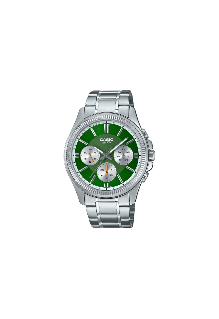 A perfect blend of elegant design and practical functionality . The Casio MTP- 1375D - 3A stands out for its 42 mm stainless steel case and refined green dial, a shade that catches the eye without sacrificing understatement . The three subdials add utility and a sporty touch , making it an ideal watch for everyday use .