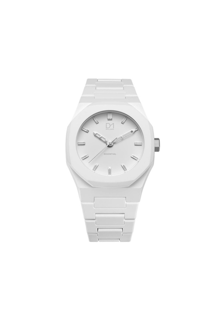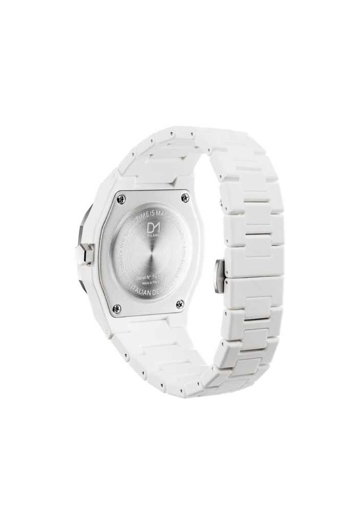The D1 Milano A-ES04 is the perfect watch for those seeking a minimalist style without sacrificing functionality. The 40 mm white polycarbonate case is lightweight and durable, while the white dial with silver details adds a touch of elegance and sophistication. The white stainless steel strap, combined with the buckle closure, ensures comfort and a perfect fit for everyday use.