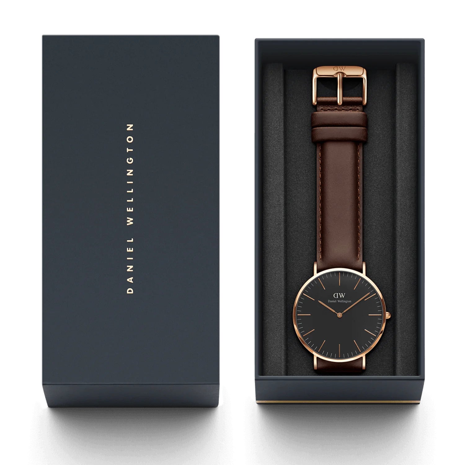 The Daniel Wellington DW00100125 embodies a refined and timeless style. Its ultra-thin 40mm rose gold PVD-plated 316L stainless steel case adds a touch of understated luxury, while the black dial creates a sophisticated contrast. The minimalist design is combined with versatility, making it the perfect accessory for any occasion.