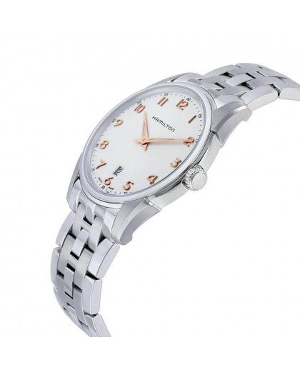 A watch that marries classic design with modern touches, perfect for the man who appreciates understated elegance. The Jazzmaster H38511143 features a 42 mm stainless steel case, just 7.35 mm thick, with an elegant silver dial embellished with rose gold-tone numerals and indexes, creating a refined and sophisticated contrast.