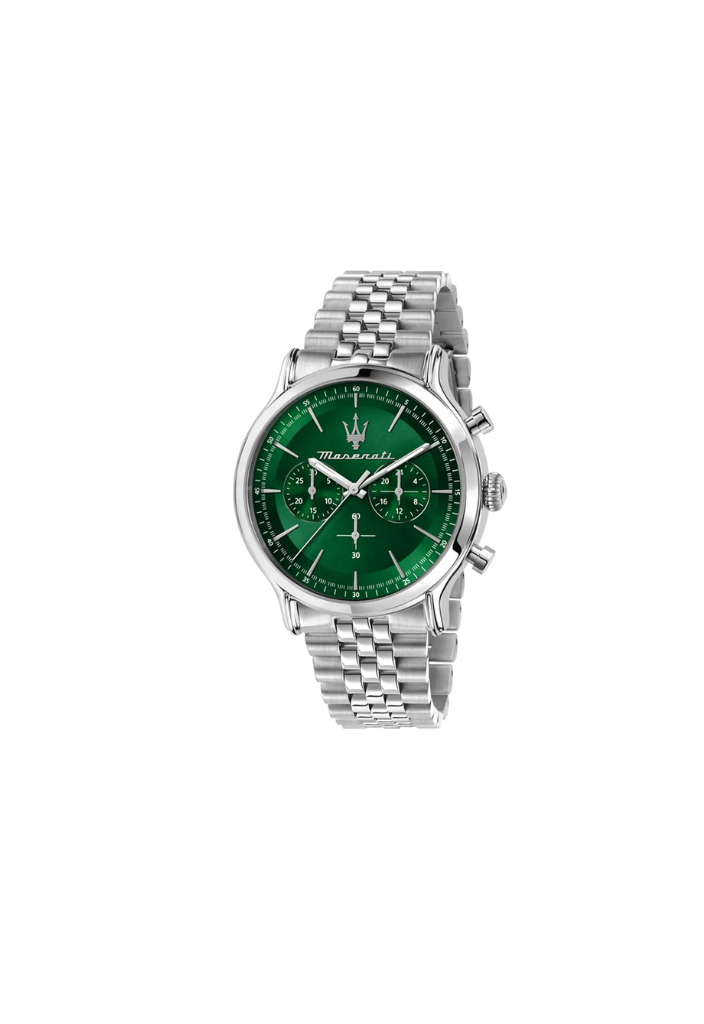 An introduction that combines essential design and functionality. The Maserati Epoca R887361 stands out for its 42 mm polished steel case and silver metal bracelet, enhanced by a refined green dial that gives the watch a unique and modern style. Equipped with a chronograph with three counters and a date display, it is designed for those who love to take care of every detail.