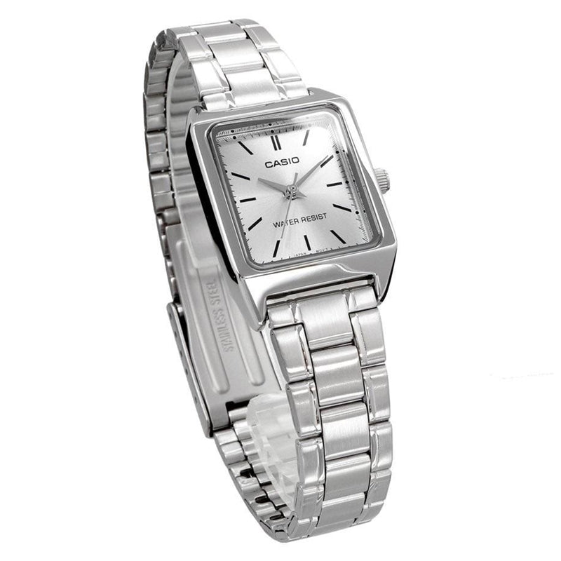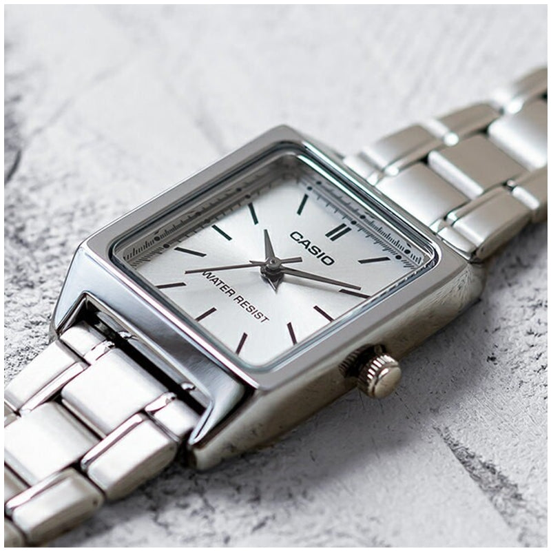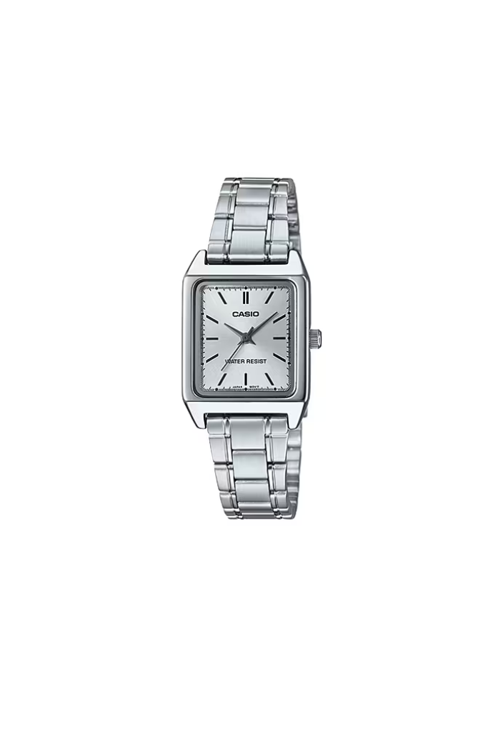 A watch that combines clean lines and timeless sophistication. The Casio LTP-V007D-7E features a compact rectangular case and a light silver dial, enhanced by black indexes and thin hands. The stainless steel bracelet adds a modern and bright touch, making it perfect for any occasion, from the office to the most elegant events.