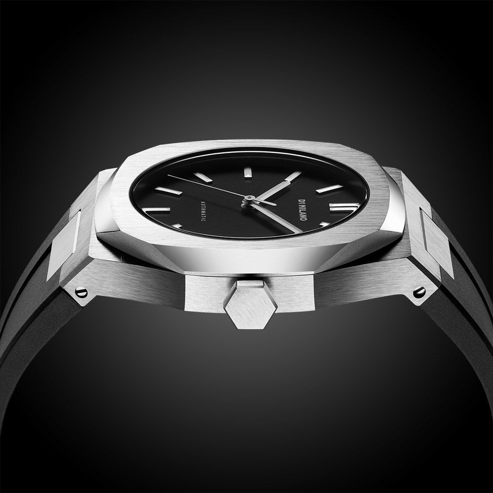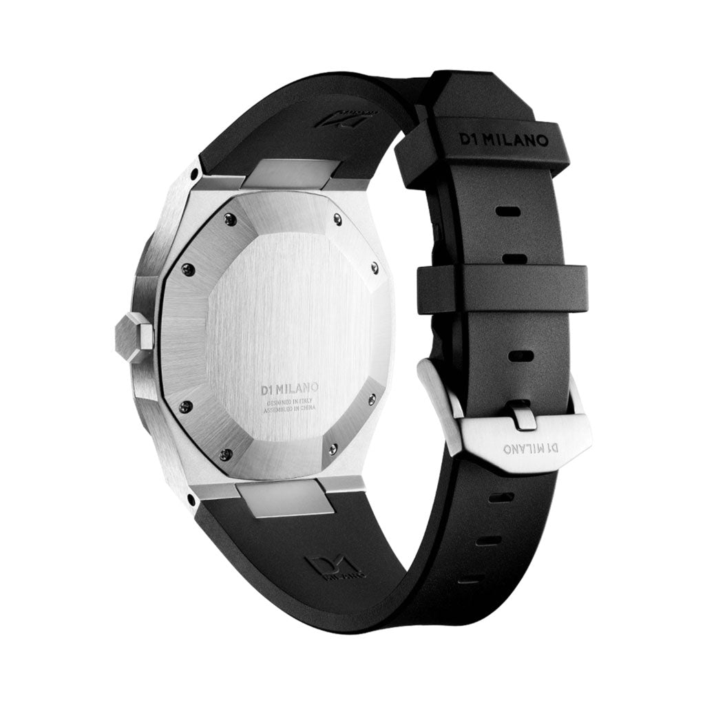 Contemporary design and refined details meet in the D1 Milano ATRJ01, an automatic watch with a technical yet refined style. The 41.5 mm steel case houses a black dial with high-visibility reflective finishes, while the natural rubber strap guarantees comfort and versatility. The Seiko NH35 automatic movement gives a mechanical soul to this timepiece designed for those who love to stand out.