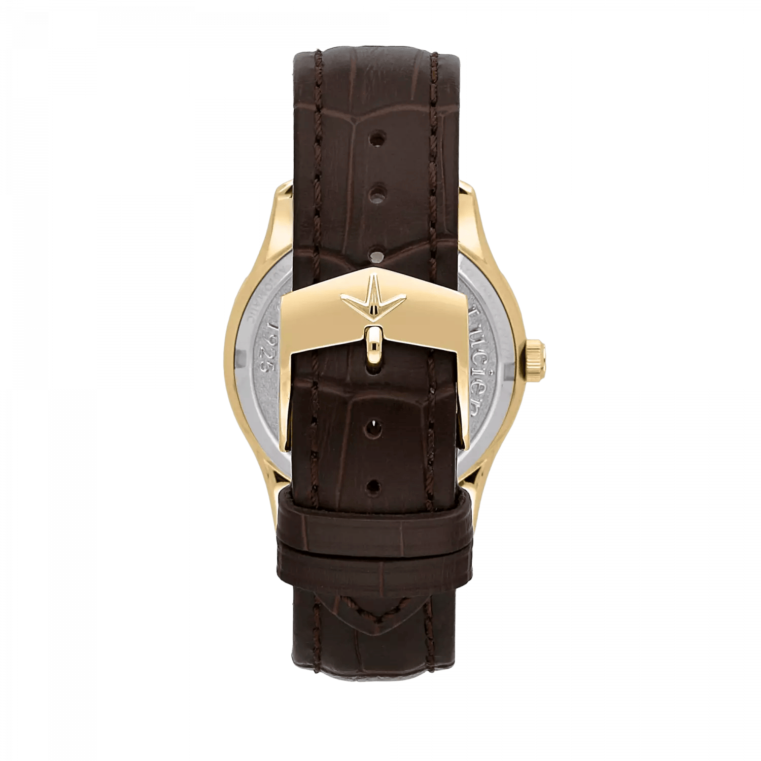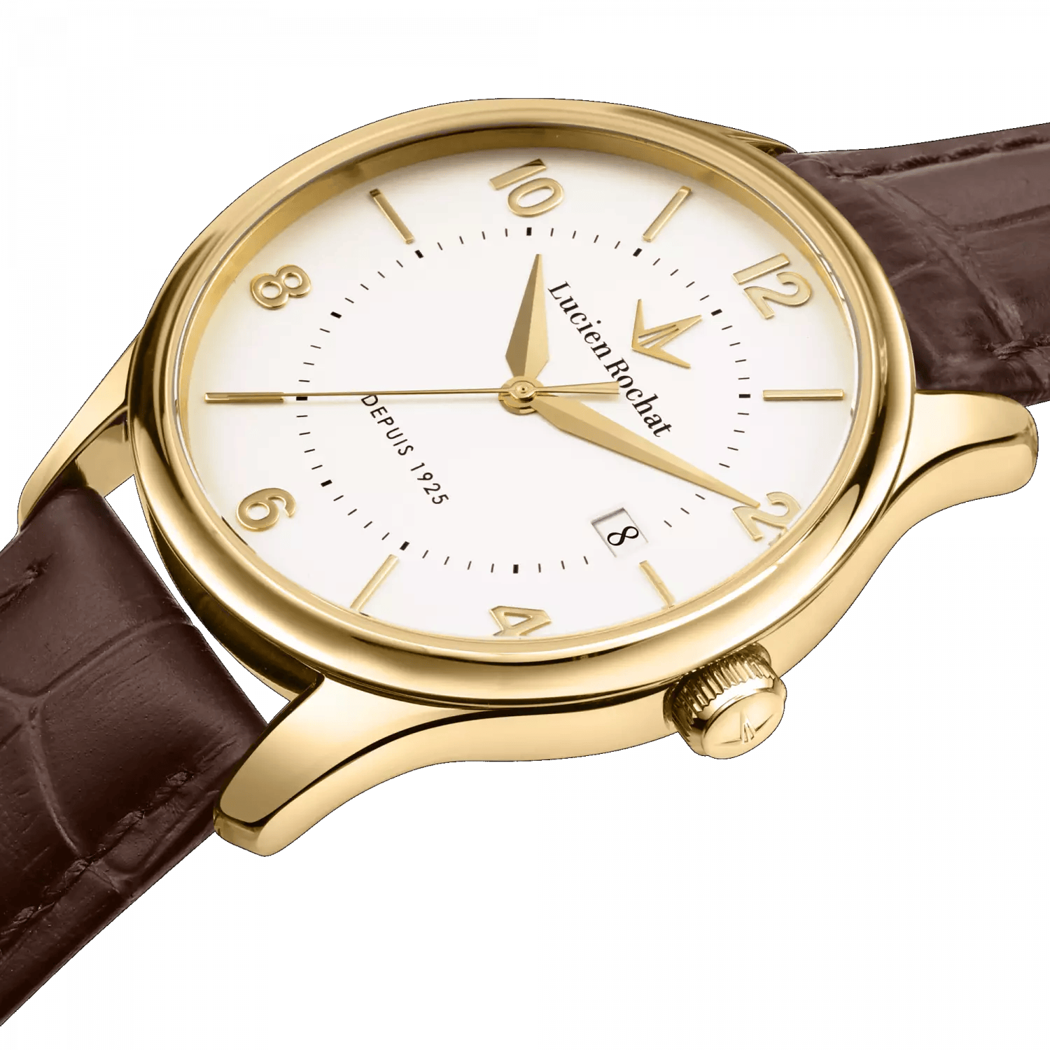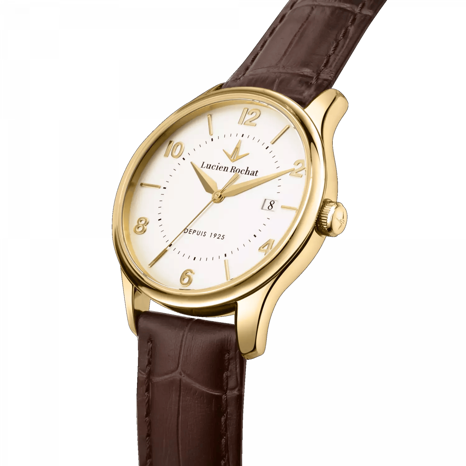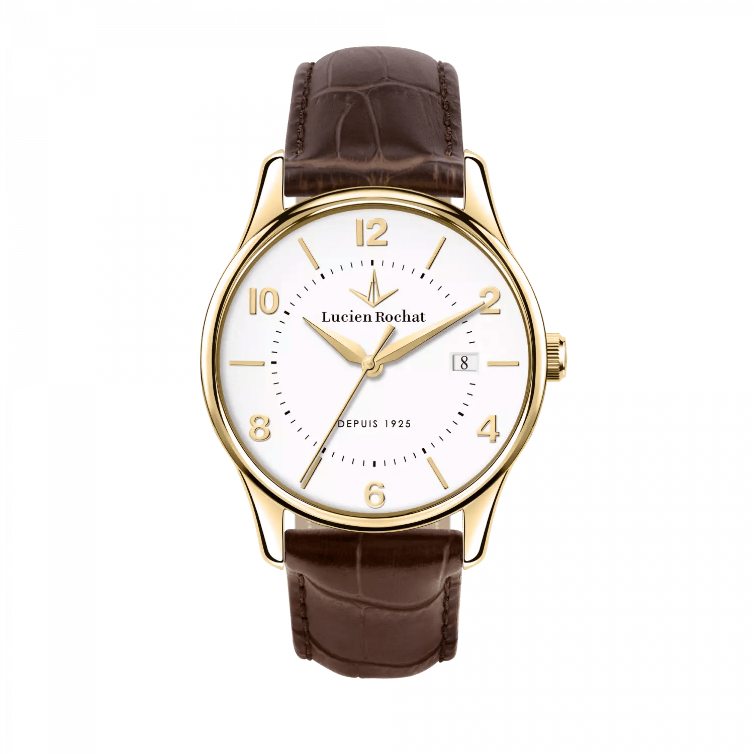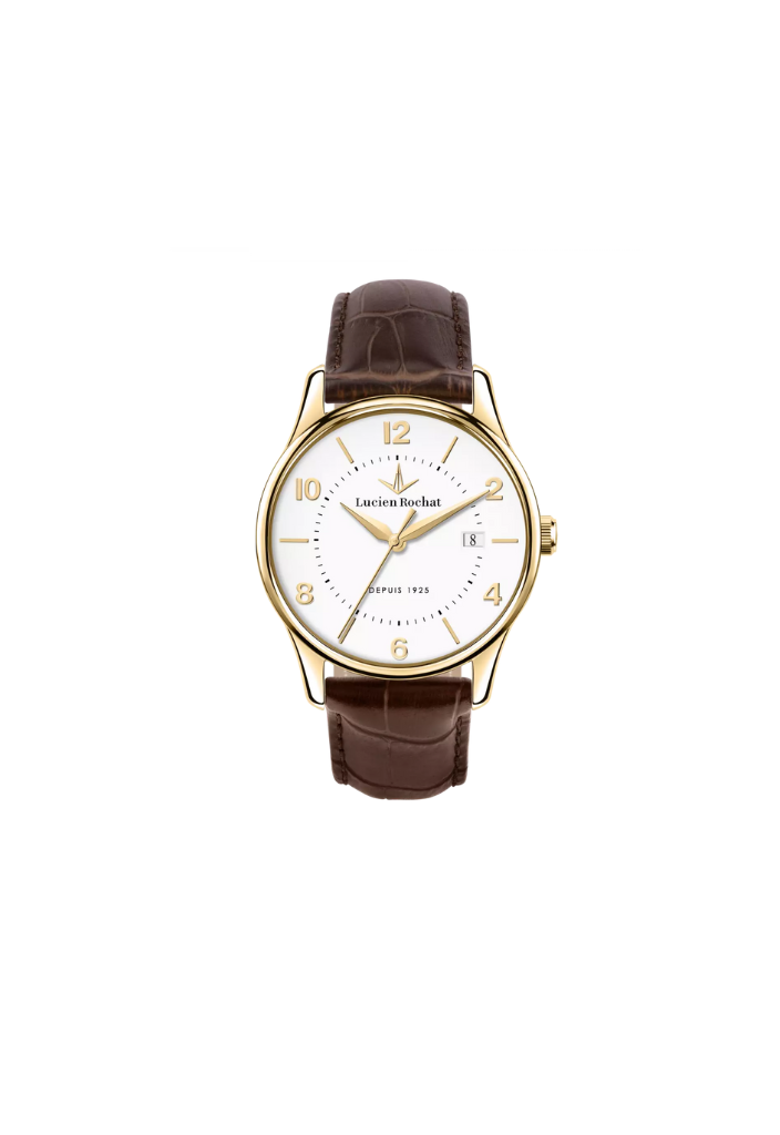 The Lucien Rochat R045 is a men's watch that stands out for its simple and elegant design. The 39 mm stainless steel case houses a simple and refined dial, protected by a treated sapphire crystal, while the brown leather strap adds a touch of class and comfort.