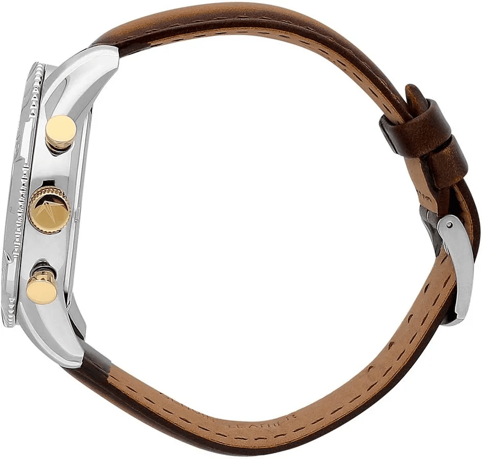 The Lucien Rochat R0471603005 is a men's chronograph that combines bold design with modern functionality. The 45mm x 52mm satin-finished stainless steel case houses a silver dial with black accents, while the brown leather strap with pin buckle completes the watch's rugged, sophisticated aesthetic.