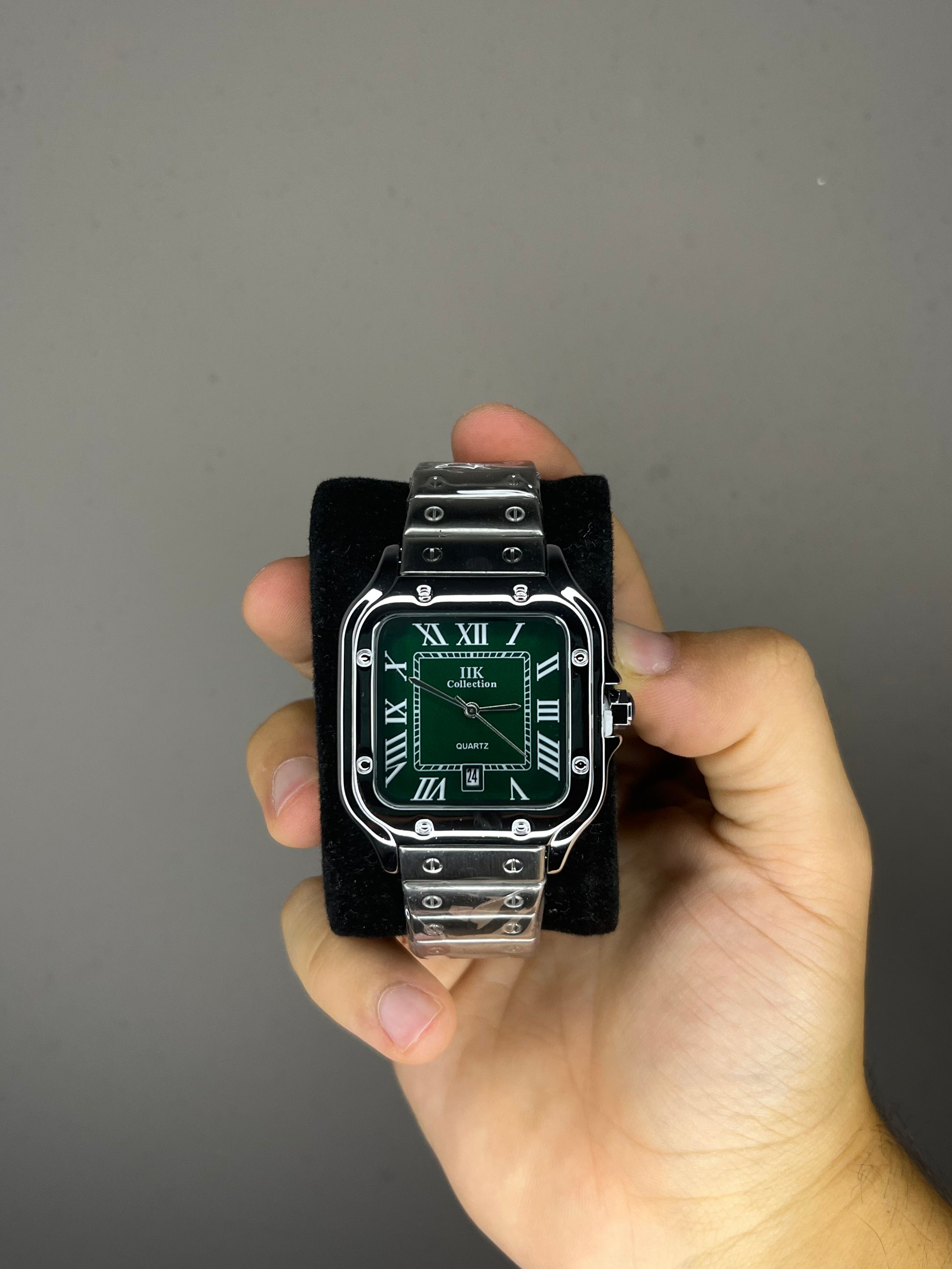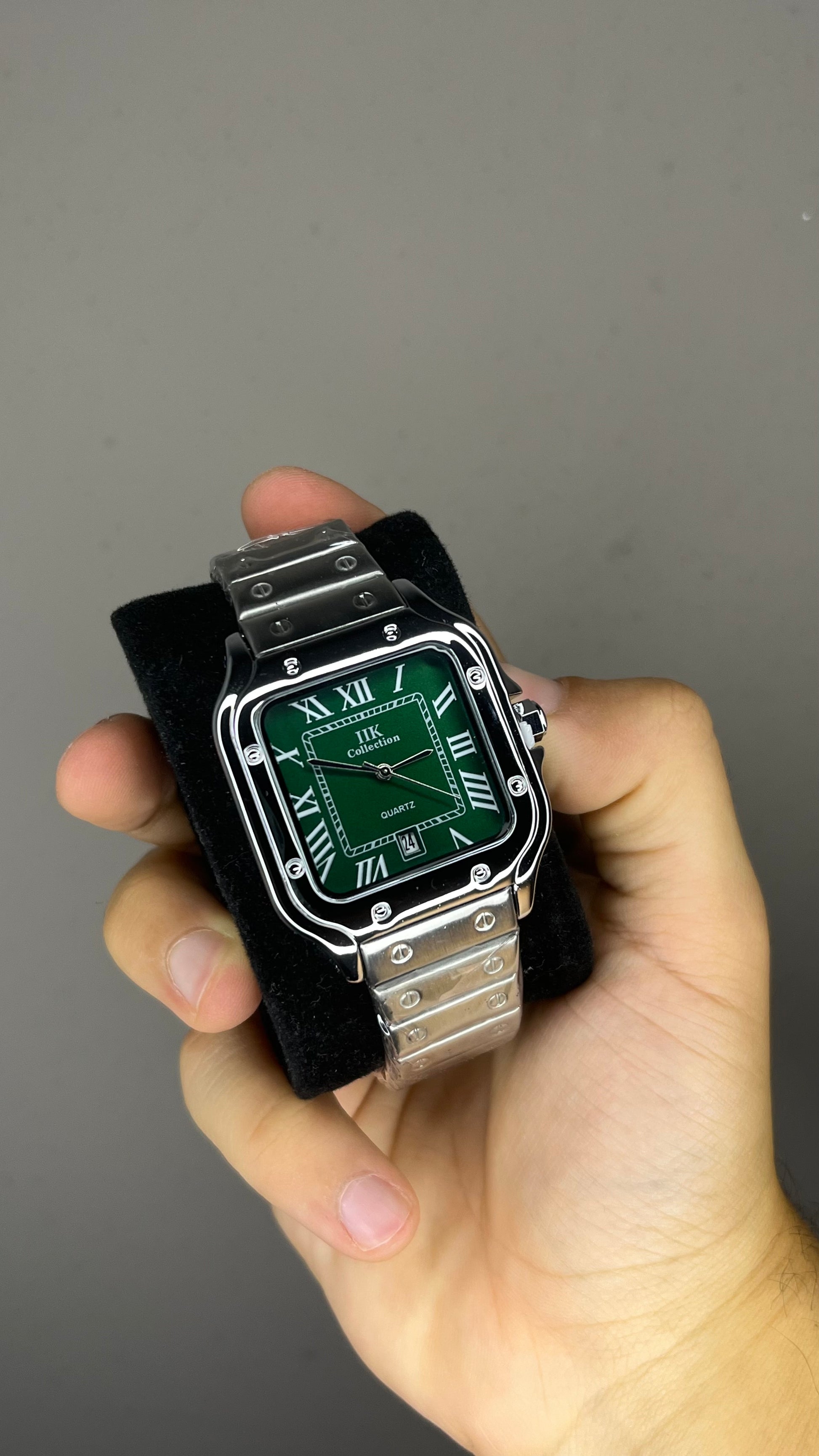 Inspired by the iconic Santos style, this 38 mm stainless steel watch is available in four elegant color variations: blue, green, black or white. With a square case and refined dial, the quartz movement ensures precision, while the date positioned at 6 o'clock adds functionality.