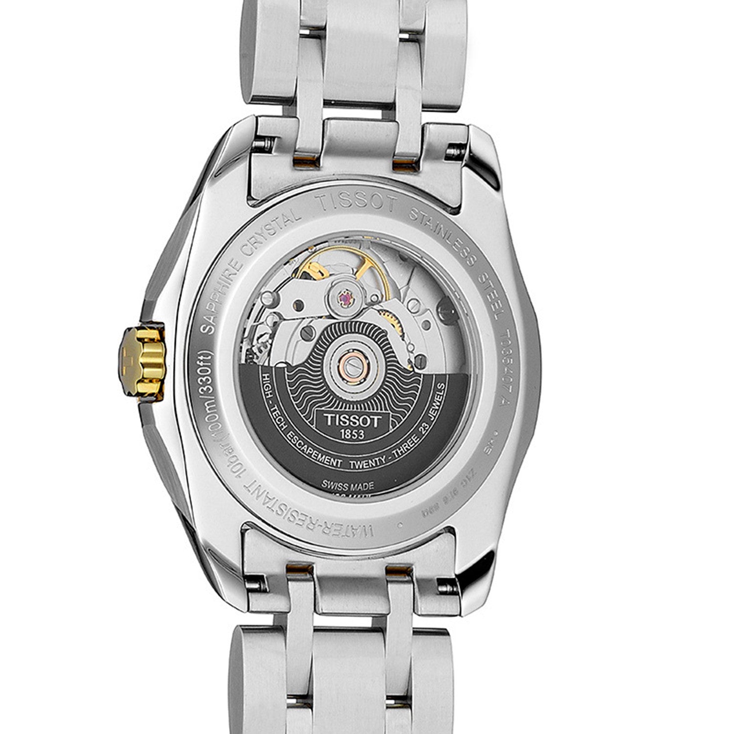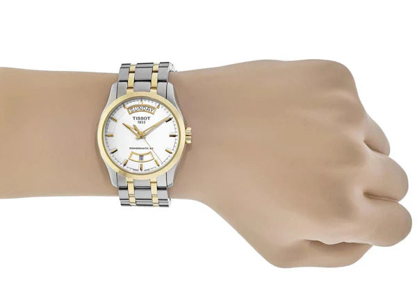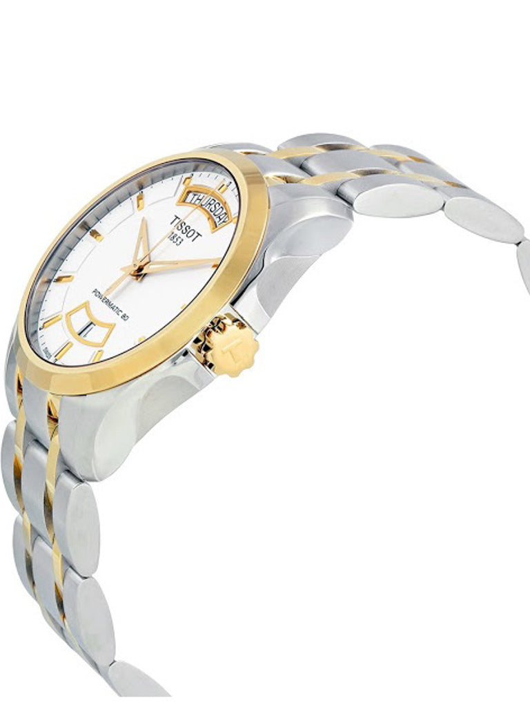 The Tissot Couturier Powermatic 80 T035 is an automatic watch that combines sophisticated design with reliable performance. Equipped with the Powermatic 80 Day-Date automatic movement, it offers a remarkable power reserve of up to 80 hours , ensuring precision and durability over time. The 39 mm 316L stainless steel case with yellow gold PVD coating perfectly matches the white dial with day and date windows. The stainless steel bracelet with yellow gold PVD coating completes the elegant and functional look.